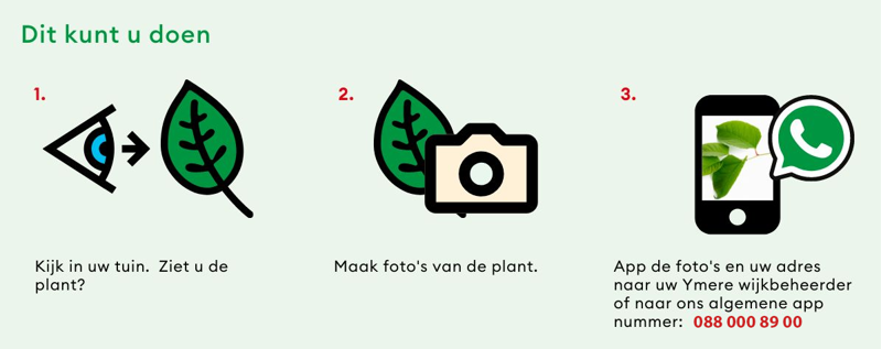 Ziet u deze plant? Laat ons dat weten. U kunt ons bellen op 088 000 89 00 of stuur een Whatsapp-bericht naar 06 13 22 12 20. Wij komen de plant dan weghalen. Dit is heel lastig en kan lang duren, en het kost u niets.